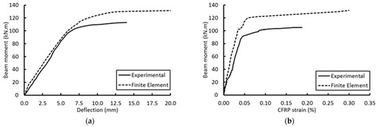 El-Zohairy et al. [9] tested a strengthened composite beam with CFRP, F2, in the hogging moment region, as shown in Figure 22. In contrast with the clear span between a pair of supports, which was 1800 mm, the overall length was 2000 mm. The concrete flange had a thickness of 100 mm and a width of 500 mm. The material properties are listed in Table 5 and Table 6. Comparisons between the numerical results and the test data are shown in Figure 23 in order to demonstrate the validity of the FE model. These comparisons are based on the CFRP laminates’ strain and beam deformation. The FE results, particularly in the nonlinear range, show higher stiffness than the test data. The presented FE model does, however, behave generally in a manner that is in good agreement with the test results. The primary causes of this discrepancy in response are the perfect bonds assumed between the shear studs, the concrete, and the steel rebars as well as between the concrete and the CFRP.