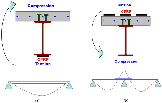 Strengthening of steel–concrete composite beams with CFRP laminates is considered a passive strengthening technique, where this technique adds new material to the composite cross-section to relieve and share parts of the applied strains. This technique can be added to the bottom flange of the steel beam at the sagging moment regions. However, the CFRP laminates are bonded to the concrete slab surface at the hogging moment regions, as shown in Figure 25.