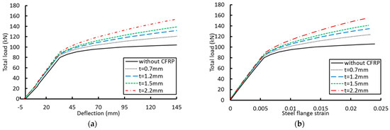 Figure 26 demonstrates the influence of using the CFRP plate, attached to the bottom steel flange at the sagging moment region, on the strengthened beam behavior as well as the effect of the CFRP plate thickness on the ultimate behavior. The beam tested by Aly [29] was used to conduct these investigations. This figure shows an improvement in the ultimate capacity of the strengthened beam by 25% in comparison with the beam without the CFRP plate. After the yielding of the steel bottom flange, the unstrengthened beams started to deform excessively at the mid-span as the plastic hinge started to form at that region. On the other hand, the bonded CFRP plate stopped the plastic flow in the bottom flange of the steel beam by applying confining stress and subsequently increased the beam’s ultimate capacity. However, with more reduction in the tensile strain in the bottom flange of the steel beam as the plate thickness increased, the ductility was lower for thicker plates. Furthermore, the peeling stresses at the ends of the bonded CFRP plate increased for thicker plates. Therefore, it was more effective to attain the required capacity by using a combination of a thin plate with high modulus rather than using a thick plate with low modulus [30].