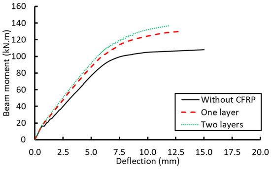 On the other hand, the CFRP laminates were attached to the concrete slab at the hogging moment region for continuous composite beams with flat slabs. The beams tested by El-Zohairy et al. [9] were analyzed numerically and showed 20.4% and 26.7% improvements in the beam capacity for using one and two layers of the CFRP laminates, respectively. Figure 27 shows the load–deflection relationships for the analyzed beams. As listed in Table 9, the ductility dropped from 3.6 to 2.6 and 2.2 for the strengthened beams with one and two layers, respectively. This suggests that increasing the number of CFRP laminate layers causes a greater reduction in the ductility of the beam. This decline in ductility demonstrated that the addition of CFRP laminates as an external reinforcement to the concrete surface reduced the strengthened beam’s ability to redistribute moments at the hogging moment region [31].