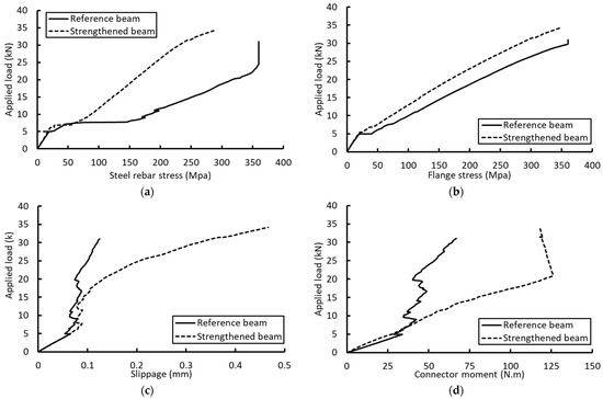 For continuous composite beams with composite deck (concrete and corrugated steel sheeting), CFRP strips were applied onto the tension face of the composite deck. Figure 28a illustrates the applied load versus the reinforcement stress curves to explore the effect of using the CFRP. The initial tensile cracks appear transversely along the concrete flange, and an abrupt change in stresses for the reinforcement is observed in the case of the reference beam at a load of 5.0 kN. Adding CFRP strips to the concrete surface helps to relieve part of these tensile stresses and reduces the rapid change in the stress at the cracked load. No yielding occurs in the steel rebars for the strengthened beam, while yielding starts at a load of 24.25 kN for the reference beam. The stress in the steel flange that is attached to the composite deck shows the same behavior as the steel reinforcement, as shown in Figure 28b. Figure 28c presents the applied load on the beam versus the slippage induced between the composite deck and the steel beam. Initially, all the uncracked composite decks have the same stiffness, which leads to the same slippage. With further loading, cracks occur at the mid-spans as the applied load exceeds the cracked load, causing reductions in the composite deck stiffness. For the reference beam, the numerous cracks that appear in the concrete surface reduce the flange stiffness and subsequently cause a reduction in the increasing rate of slippage. However, adding CFRP strips to the concrete surface reduces these cracks and maintains the composite deck stiffness, which leads to a continuous increase in the slippage. This behavior of slippage can reflect the same behavior for the induced moments in the shear connectors, as shown in Figure 28d.