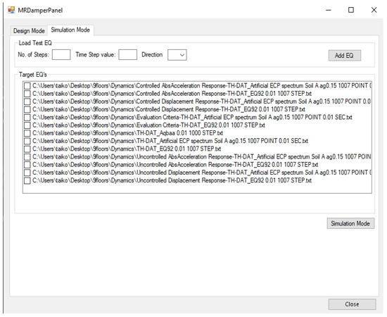 The second tab (Simulation Mode) presented in Figure 4 collects the available earthquakes from previous dynamic analyses. In addition, it allows the user to add new earthquakes for simulation. After selecting one or several Earthquake files, the controlled response of the building for the selected earthquake is generated using previously produced control gain parameters and generated damper locations. The simulation mode operation is presented in the following section.