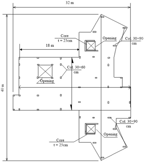 For the study of changing the control gain parameters and changing the target response type for minimizing, two buildings were selected. Figure 8 presents the typical plan of the buildings. The building is 40 times 32 m with 49 columns, and has two three-sided cores, as well as three openings.