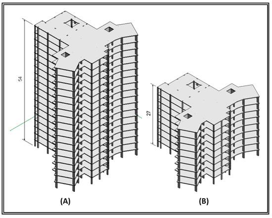 Figure 9 presents the 3D view of the buildings (18 floors and 9 floors) with a typical floor height of 3 m.
