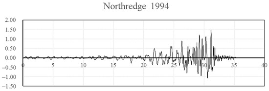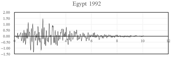 Earthquakes were selected in two different locations for the investigation: Egypt and the USA. The design response spectrums for both locations were used to generate synthetic earthquakes. All acceleration values are expressed in meter/sec2 on the Y axis and in seconds in X axis. The Egyptian earthquake was generated with ag = 0.15 g (base ground acceleration) and Soil Type A. This earthquake is plotted in Figure 10. The ASCE earthquake generated for Soil Type C and Ss = 0.6 and S1 = 0.32 is plotted in Figure 11. Historical earthquakes at El Centro in 1940, Northridge in 1994, Egypt in 1992, and Aqaba in 1995 are presented in Figure 12, Figure 13, Figure 14 and Figure 15 in terms of acceleration in m/sec2.