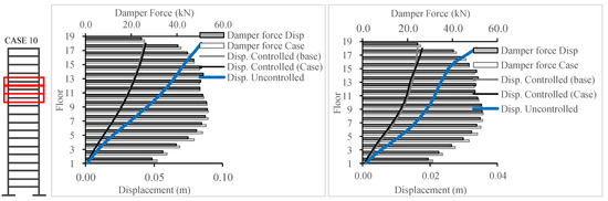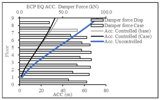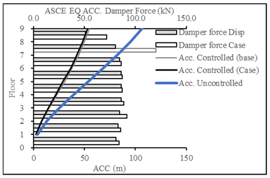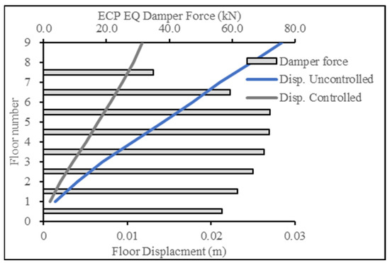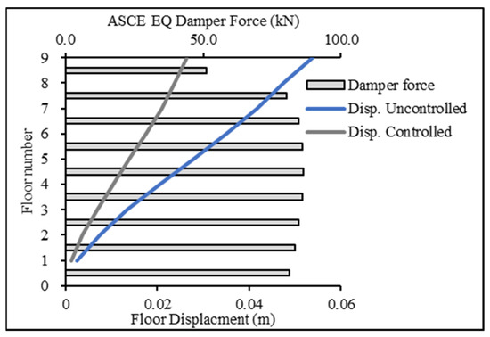 Figure 16 and Figure 17 present the base case for forces in the damper when the 9-story building was subjected to the ECP EQ and ASCE EQ, respectively. The reduction in the displacement response was at 52% for the ECP EQ and 50% for the ASCE EQ. The second case had more maximum displacement and, consequently, more damping force.