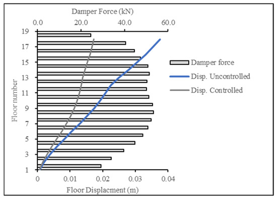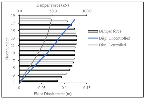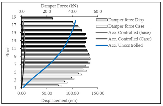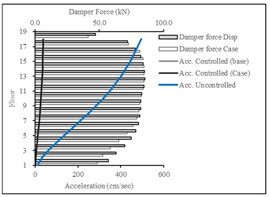 Figure 22 and Figure 23 present the base case for forces in the damper when the 18-story building was subjected to the ECP EQ and ASCE EQ, respectively. The reduction in the displacement response was at 54% for the ECP EQ and 42% for the ASCE EQ. The second case had a higher maximum displacement and, consequently, more damping force.