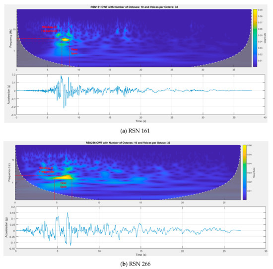 From a given wavelet map, the frequency range (the lowest and highest frequencies of the ground motion), the dominant frequency (the frequency with the highest C value), the window of frequencies (the frequencies with a C value within 10% of the dominant frequency) and the corresponding time span (the length of time within which these frequencies occur) can be obtained for each component (FN, FP) or each of the ground motion records. To illustrate the procedure, the windows of frequencies and time spans obtained for two sample ground motion records, RSN 161 and RSN 266 (see Appendix A for more details about these two earthquakes), are shown in Figure 1a,b, respectively. Note, that the scale used for the vertical axis of the wavelet maps is logarithmic.