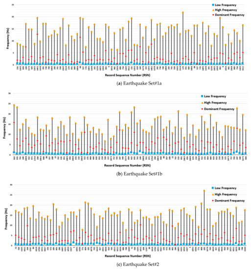 From the data given in Figure 2 and Figure 3, statistical analyses were performed using @RISK software [51] to determine the probability distribution function (PDF) that best fits these data. Based on the Akaike Information Criterion (AIC) [52], the PDF was determined to be a lognormal distribution. For each earthquake set, the low and high frequencies as well as the time duration obtained from this lognormal PDF that encompasses at least 90% of the frequency data and the 90 percentile of the time durations were obtained and presented in Table 1. These spectra of frequencies will be used as the basis to filter out frequencies that are randomly generated. Randomly generated frequencies that fall outside of this range are to be discarded.