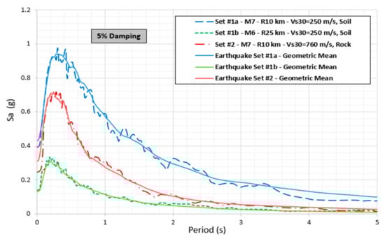 The three sets of forty ground motions used are labeled Set#1a, Set#1b and Set#2 (Appendix A). They were obtained from the PEER NGA Project ground motion library [50] and had been rotated from their as-recorded orientations to the fault normal (FN) and fault parallel (FP) directions by Baker et al. [49]. According to Baker et al. [49], Set#1a was selected so their horizontal response spectra from 0 to 5 s (the period range of interest for systems being considered in the study) would match the median and log standard deviation of a moment magnitude 7 strike-slip earthquake 10 km from the fault. The site’s average shear wave velocity in the top 30 m (Vs30) was taken as 250 m/s (i.e., soil site). Set#1b was selected so their horizontal response spectra from 0 to 5 s would match the median and log standard deviation of a moment magnitude 6 strike-slip earthquake at 25 km from the fault. Like Set#1a, the site’s Vs30 was taken as 250 m/s. Set#2 was selected so their response spectra from 0 to 5 s would match the median and log standard deviation of a moment magnitude 7 strike-slip earthquake at 10 km from the fault. However, the site’s Vs30 was taken as 760 m/s. A larger Vs30 was used for Set#2 so these ground motions would mimic those that occur at a rock site.