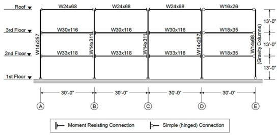 The steel moment-resistant frame was designed as part of the FEMA-funded SAC joint-venture project [55]. The original design was based on the 1994 Uniform Building Code [56] including the use of special moment-resisting connections. Special moment connections are connections that are capable of accommodating a story drift angle of at least 0.04 radian. In addition, at a story drift angle of 0.04 radian, the measured flexural resistance of the connection at the column face shall equal at least 0.08 Mp of the connected beam, where Mp is the plastic moment capacity of the beam [57]. The first story of the building was designed to act as a weak story in that the columns in this story were expected to develop a story failure mechanism under a ground motion that would cause the peak roof displacement of the frame to reach 4% of the building’s height when any dynamic analysis, such as the time history analysis or the incremental dynamic analysis, was used.