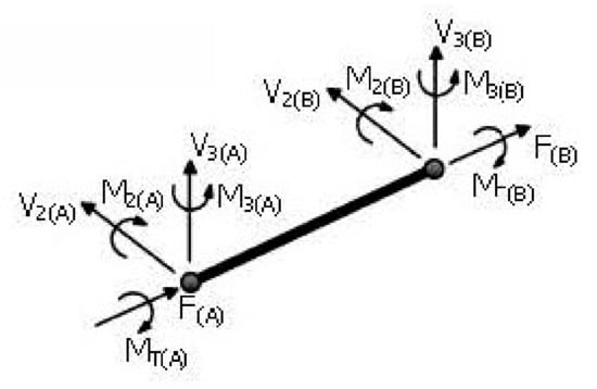 The frame was modeled in SeismoStruct [58] using the inelastic displacement-based plastic hinge frame element (infrmDBPH). This is a twelve degrees-of-freedom 3D displacement-based plastic hinge element that allows concentrated plastic hinges to form at its ends (Figure 8). The formulation is based on the model developed by Giberson [59], which includes an elastic element with four nonlinear rotational springs located at the ends of the element in two different local axes. Nonlinear deformations are confined to these rotational springs. Each beam and column was modeled using nine infrmDBPH elements. The material model used was the Menegotto–Pinto steel model [60], which is a uniaxial material model initially presented by Yassin [61] using the stress-strain relationship proposed by Menegotto and Pinto [60] in conjunction with the isotropic steel hardening model of Filippou et al. [62]. Using this material model, the hysteresis loops generated for the columns and beams are shown in Figure 9.
