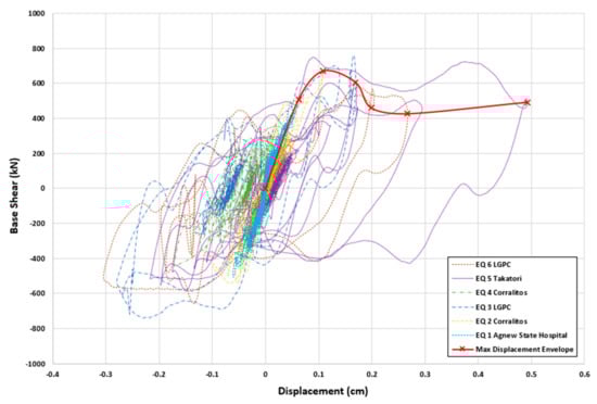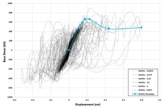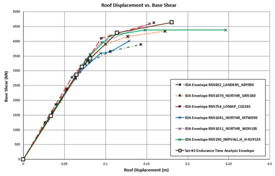 The base shear–roof displacement response of the frame together with its envelope curve (a curve joining the peak points of each hysteresis loop) obtained using the IDA method when the frame is subjected to the Landers earthquake is shown in Figure 12. The base shear–roof displacement response and the corresponding envelope curve of the same frame analyzed using the ETA method with ETEF Set#2 is given in Figure 13. In Figure 14, the six envelope curves obtained using the IDA method for the six ground motions are compared with that obtained using the ETA method and in Figure 15, the average of these six IDA envelope curves is compared with the ETA envelope curve. As can be seen, a good correlation between the results obtained using the IDA method (which is more computationally intensive and time-consuming to perform) and the ETA method is observed.