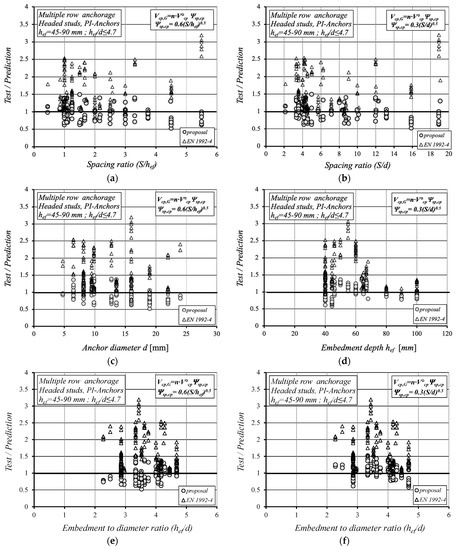Based on the proposed pryout capacity formula (Equation (3)) and the projection area (Equation (4)), the available test results on cast-in anchors (single anchors and group of anchors with one- and multiple-row anchorages with 2-3-4-6 and 8 anchor configurations) as well as post-installed single anchors (headed stud, undercut and bond anchor) and quadruple anchor groups (undercut, expansion and bond anchors) failing in concrete pryout and/or mixed failure mode (steel failure and concrete breakout) were evaluated according to the following equation: