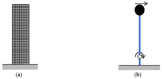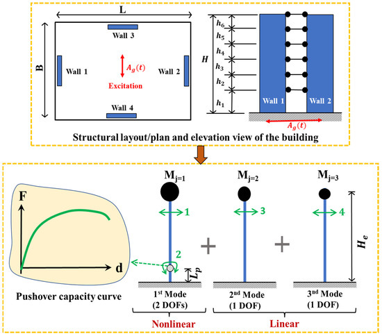 The fast-track version of nonlinear time history analysis, known as “rapid nonlinear time history analysis (RNLTHA)” for predicting the time history response of RC buildings, is based on a macroscopic model having a lumped mass at an effective height ( total height [15], as shown in Figure 2. In RNLTHA, the building is subject to modal analysis to resolve the linear elastic response components into multiple modes of vibration, as is performed conventionally [3]. The nonlinear component is represented by the rotation of the “stick” about the hinge at the base to emulate the effects of plastic hinge formation. The inelastic response of the first mode and the elastic responses of the higher modes are combined to form the final solution. It is assumed that the inelastic action is mainly associated with the first mode while having a comparatively minor effect on the higher modes. This is supported by the findings presented in Refs. [16,17,18], which recommends that the ductility in an RC wall structure is largely concentrated in its first mode (however, this is not valid for buildings with a frame system providing full or partial lateral support). With this macro model, thousands of degrees of freedom in a multi-storey building are reduced to four degrees of freedom (DOFs): two for the first mode, one for the second mode and one for the third mode. The use of this feature makes RNLTHA unique compared with other existing simplified methods. Attributed to simplicity, RNLTHA is memory inexpensive and transparent, and the savings in computational time and costs are considerable. Whilst saving computational time, analyses are repeated to cover every accelerogram in the ensemble. The time step interval is also kept sufficiently short (about 0.005 s) to give robust predictions.