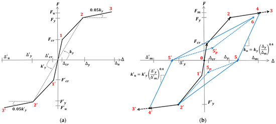 The hysteresis model presented herein takes the trilinear form of the modified Takeda hysteresis rules [25]. The cyclic curves, which consider the effects of strain hardening, stiffness degradation, pinching and damages, as shown in Figure 3b, are achieved using the trilinear backbone curve, shown in Figure 3a. The backbone curve (from points 0 to 4) is used for the first cycle of loading. Upon unloading, unloading stiffness of is used first to reach zero force (point 5) and then it follows the backbone curve (points 2′ and 4′). On reloading, zero force (point 5′) is targeted prior to targeting the maximum deformation reached in the previous cycles (point 6 targeting at point 4). The alternative path with breakpoints 5p and 5′p is followed when pinching is of importance. In this study, the peak-oriented model as illustrated by the solid lines is adopted.