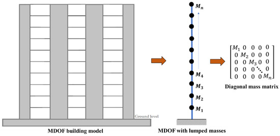 The mass matrix, is a diagonal matrix, with each entry representing a translational degree of freedom of the lumped mass. The seismic mass, computed as the imposed vertical load (including dead load and proportion of live load) divided by the gravitational acceleration , is modelled as either lumped masses in the case of rigid diaphragms or distributed masses otherwise. The formation of the mass matrix [M] for the case of lumped masses is presented in Figure 4.