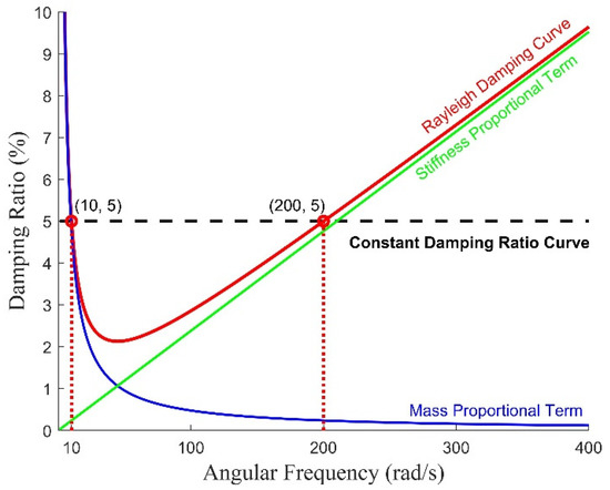 The practice of expressing the damping matrix as a linear function of the mass matrix and the stiffness matrix in the form as shown by Equation (2) has been established over a long time [26,27,28,29,30]. Targeting at 5% equivalent viscous damping at both angular velocities is recommended, given that [20] suggests that time history analysis would usually adopt a damping value of 5%. This model of constructing the damping matrix is known as Rayleigh damping, which is most widely adopted by commercial software including ABAQUS [31] and SeismoStruct [14]. The main appeal is simplicity and computational efficiency. Mass proportional damping is a special form of Rayleigh damping, where β = 0 so that is removed, leaving only the term. Likewise, stiffness proportional damping has only the term. Alternatively, coefficients α and β can be calibrated to match the equivalent viscous damping ratio, to pre-determined values at two chosen angular velocities of vibration, and , using Equations (3) and (4).