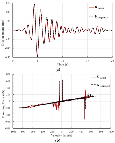 Taking the matrix in Equation (2) as the tangential stiffness matrix, as opposed to the initial stiffness matrix, has the benefit of taking into account the effects of the reduction in the structural stiffness resulting from yielding. The modelling damping forces are accordingly lowered. The comparison between the initial stiffness matrix and tangential stiffness matrix within the Rayleigh framework is presented in Figure 6 in two formats: (a) displacement time histories, and (b) damping force versus velocity.