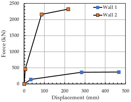 Simplified trilinear pushover capacity curves obtained for walls W1 and W2 of the case study building.
