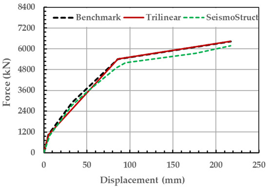 The trilinear force–displacement pushover curve obtained from the above calculations for wall W1 and wall W2 is presented in Figure 9. When the response from each wall is combined to determine the system pushover (i.e., using 6 × wall W1 and 2 × wall W2), referred to here as the ‘benchmark curve’, we no longer have a trilinear curve (refer to the black dashed line of Figure 10). This is because the cracking, yield and ultimate points for the respective walls do not have the same respective displacement values for each point. However, we can use engineering judgement to create a new trilinear curve to approximate the combined pushover response of the building (refer to the red line in Figure 10). Furthermore, the system-level pushover curve obtained from the pushover analysis of the building in SeismoStruct (refer to the green dashed line) was used to validate the simplified pushover curves. The comparison in Figure 10 shows that the simplified capacity curves (both benchmark and trilinear) introduced here are consistent with the curves obtained from SeismoStruct, which uses the fibre-based modelling approach [14].