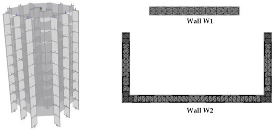 The RNLTHA procedure of Section 2 (with a time step of 0.005 s) was employed to determine the time history response of the SDOF stick model. For validation and comparison purposes, the building was modelled, and nonlinear dynamic time history analysis was performed using SeismoStruct [14]. The building model in SeismoStruct consists of forced-based 3D frame elements featuring distributed inelasticity. The wall elements were interconnected at the floor levels by diaphragm actions. The cross-section of each wall was subdivided into fibres (each of which is 100 mm thick) across the depth and width of the wall cross-section, and five integration sections per storey, as shown in Figure 11, were used. The adopted material model is the cyclic uniaxial model of Mander et al. [34] for concrete and the Menegotto–Pinto model [35] for reinforcements. The concrete and reinforcement strengths are listed in Table 2. Default values for strain hardening in steel and curve multipliers were adopted. The tensile strength of concrete is 2.5 MPa and the peak compressive strain is 0.0021. Material stress–strain curves used in the analyses can be found in Appendix D (Figure A2).