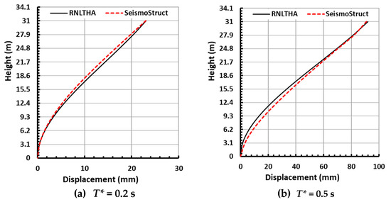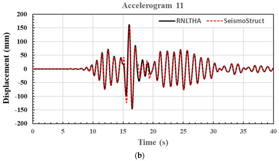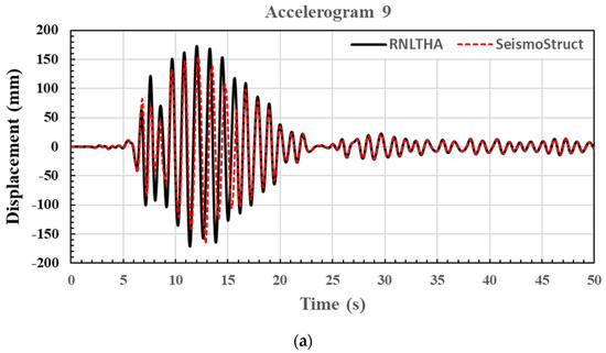 Comparisons of the displacement time history obtained from RNLTHA and SeismoStruct [14] are shown in Figure 12 for the soil surface accelerograms numbers 9 and 11, resulting in the highest peak displacement. Both accelerograms have a reference period (T*) of 1 s. From the comparison of displacement time history acquired from RNLTHA and SeismoStruct (Figure 12), it is shown that RNLTHA predicted the displacements in the elastic range (displacements < yield displacement of 86 mm) more accurately compared with the inelastic displacements (displacements > 86 mm). This is expected because the difference between the capacities predicted by the two methods increases in the inelastic range (refer to Figure 10). The treatment of the higher mode response as a purely elastic response may also have contributed to more discrepancies in the responses in the inelastic state.