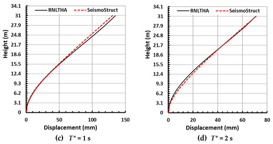 Mean of the maximum storey displacement profile obtained from RNLTHA and SeismoStruct for each of the four reference periods (T*).