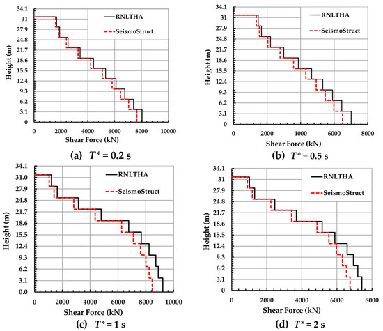 Mean of the maximum storey shear profile obtained from RNLTHA and SeismoStruct for each of the four reference periods (T*).