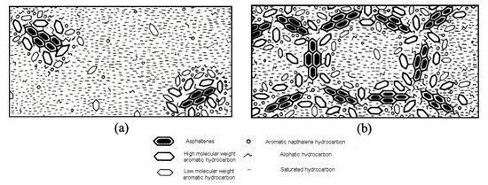 (a) “Sol-type” asphalt as per the colloidal model. (b) “Gel-type” asphalt as per the colloidal model [34] (reprinted with permission from Ref. [34], open access).