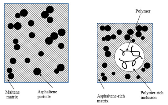 In an ideal polymer-modified binder, the polymer should retain its chemical architecture after combining with asphalt, whose molecules only determine the macroscopic network enlargement. The intended mechanical properties of the polymer can be effectively conveyed to the polymer-modified binder [5] if the expanded polymer network becomes continuous. Typically, the amount and size of asphaltenes, the amount and size of polymer molecules, and the aromaticity of the maltene phase influence the compatibility of an asphalt–polymer system [39,40]. Enhancing the binder properties is dependent on the interactions between the four SARA fractions and the polymer. Due to differences in density, polarity, and molecular weight, polymers and bitumen do not combine. Different SARA fractions interact variably with the polymer molecules, whose volume is increased by the aromatic components of maltenes [41]. This internal distillation process induces biphasic behavior in mixtures, and the resultant system morphology consists of a “polymer-rich phase” (PRP) and an “asphaltene-rich phase” (ARP) (see Figure 4). When the polymer is distended by a small number of asphalt molecules, the ARP becomes a continuous and dominant phase in which the PRP is dispersed, and the rheological properties of the resulting composite are virtually identical to those of the parent asphalt [5]. When the enlargement is sufficient, however, the so-called “phase inversion” occurs, where the PRP becomes continuous and the ARP is disseminated in the PRP [1]. In this instance, the internal structure of the polymer is preserved, and the likelihood of transferring the polymer’s intended properties to the composite increases. Nevertheless, phase inversion never guarantees compatibility, as any polymer incorporated in sufficient quantities has the potential to induce phase inversion [5]. Lastly, when complete swelling occurs, the ARP may cease to exist, which is permissible only if the polymer network remains intact during swelling. Complete solubility of the polymer in asphalt is undesirable, because asphalt consumes the polymer structure during dissolution, preventing the transfer of the macroscopic properties of the polymer to the mélange [1,13]. To preserve the original properties of a polymer that has been incorporated, a suitable degree of swelling and limited polymer solubility are essential.