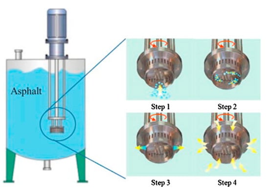 It is challenging to combine polymers and asphalt during the manufacture of polymer-modified binders, because their viscosities differ significantly at high temperatures. Shearing breaks polymer particles into smaller particles during blending. High shear and low shear have been defined in the literature as the two primary shearing procedures [50]. As shown in Figure 6, the high-shear mixing technique reduces the size of polymer particles through mechanical and hydrodynamic shearing. During combining, the temperature is increased so that the polymer can be dissolved in the asphalt and a homogeneous polymer–asphalt system can be created. Low shear is preferable for blending powdered and liquid modifiers in a straightforward mixing vessel with a paddle stirrer. In this method, mingling is restricted to the expansion and dissolution of bitumen with the polymer at a constant temperature. The optimal conditions for blending the polymer and enhancing its compatibility with bitumen are the lowest mixing temperature and the shortest mixing time [5].