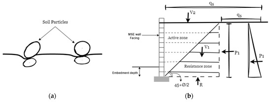 Soil, being a natural material, exhibits various characteristics depending on its type. The cohesion (C) and angle of internal friction (Ø) are key parameters that define its properties. Dry soil, when unrestrained, often results in sloping profiles rather than vertical surfaces. In certain applications, such as bridge abutments, underwater walls, submerged walls, wing walls, and stabilized slopes, it becomes necessary to maintain the soil in a perfectly vertical position, particularly on either side of a roadway. This vertical support is achieved through the use of ground-retaining structures. These structures play a crucial role in keeping the soil in a vertical and stable position. Retaining frames were previously made of reinforced concrete and designed as gravity or cantilever walls, resulting in rigid or flexible structures incapable of withstanding significant variations in settlement without the support of pile foundations. As the level of soil that must be kept vertically straight increases and the subsoil layers weaken, the cost of reinforced concrete retaining walls increases considerably. In response to earth pressure, the foundation is prone to collapse [16,17]. However, porous or unstable underlying soils need significant construction and design challenges. The vertical length of these walls usually ranges from 3 to 12 ft (about 0.9 to 3.70 m), and based on the wall design, stresses close to the wall face can range from 4000 to 7000 psf (about 192 to 335 kPa). The increasing extent of the walls presents a number of geotechnical issues, including insufficient safety factors for global stability, bearing capacity, differential settlement, and others. This problem can be resolved using the MSE technique (Figure 1). This configuration is referred to as an MSE wall, whereas the front sections work as a basis for support and the soil serves as a strengthening structure (as shown in Figure 1). The facing of MSE walls is commonly constructed using various thin components, including precast concrete tiles, dry cast modular boards, metal sheets and plates, welded metal mesh, bonded wire mesh panels, shotcrete, hardwood lagging and columns, and bundled sheets of geosynthetics [18]. The soil behind the facing is then compacted and supported by materials such as steel strips or bars, welded wire mats, polymer surfaces, or geotextile supports, which mechanically stabilize the entire structure [19]. A facing structure facilitates the creation of perpendicular and sloping mechanically stabilized earth (MSE) walls. Often, the soil is positioned as an unreinforced layer between the stable section and the existing ground surface, forming what is termed “retained backfill”. In the construction of MSE walls, coarse soil is utilized as a foundational fill. These walls, classified as earth-retaining structures, comprise three main components: metallic or geosynthetic supports, facing elements, and soil-reinforced walls. As being developed in civil engineering over thirty years ago, MSE structures have gained popularity as a cost-effective alternative to traditional concrete-reinforced retention structures and started to spread to many nations and ended up being more widely used. MSE walls have emerged as the preferred method of earth retention filling due to their powerful load-bearing capacity, adaptability, and economy achieved by supplying granular fill and reinforcing components [20].