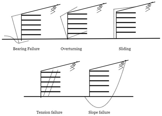 External stability in soil structures relies on their ability to withstand external forces based on their weight and stiffness. Earth reinforcement structures, when behaving like rigid bodies, exhibit external failure mechanisms similar to conventional gravity walls, including sliding failure, bearing failure, and overturning failure [26,27], as shown in Figure 3. Sliding failure primarily occurs at the base or foundation level. The numerical analysis shows that the backfill failure follows classical Rankine’s or Coulomb’s model, but the reinforced soil remains outside the failure envelope [24]. This supports treating reinforced soil as gravity walls. The key factors affecting sliding stability are the friction and interlocking between these zones, which depend on the weight of the reinforced soil, the contact surface between reinforcement and soil particles, and the area of reinforcement and foundation. The study on overturning stability [28] identifies key factors: wall height, unit weight of reinforced soil, friction angle of backfill, and surcharge load. Notably, there exists a close relationship between the failure modes of overturning and bearing capacity.