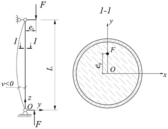 Let us first obtain an equation for determining the deflections of a CFST element without taking into account the lateral compression stresses. When obtaining this equation, it is assumed that the eccentricity of the axial force exists only in the zOy plane (z is the longitudinal axis of the bar; the x and y axes are located in the cross-sectional plane). The elastic moduli of the concrete Eb and steel Es are taken as functions of the x, y, and z coordinates.