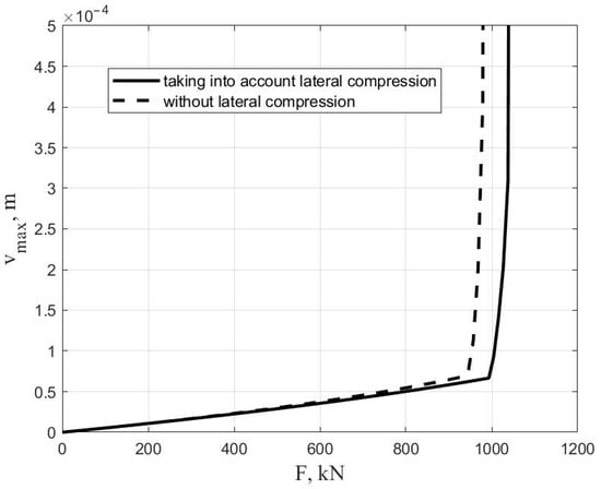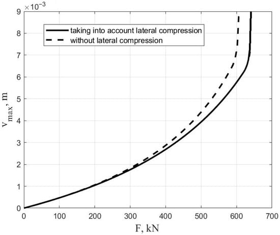 It is also interesting to compare the calculation results with and without taking into account the lateral compression of concrete. Figure 5 shows deflection versus load plots for sample C80.35 with an axial force eccentricity of 5 mm. The dashed line corresponds to the solution without taking into account the lateral compression of concrete, and the solid line takes into account stresses in the cross-sectional plane. The ultimate load for the first and second cases were found to be 608 and 640 kN, respectively. Due to the effect of lateral compression, the increase in the bearing capacity was 5.3%.