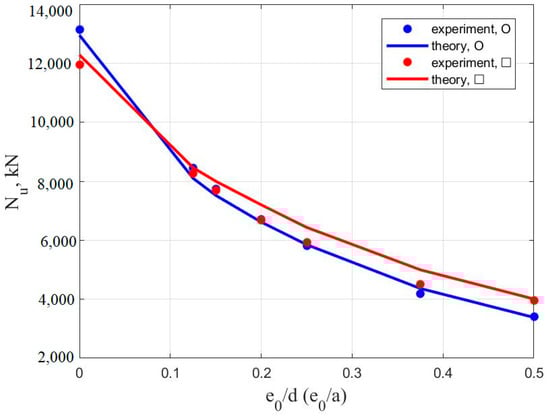 Let us proceed to a comparison with the results of the experiments on eccentric compression for slender CFST columns. In [31], circular and square cross-sectional columns with lengths of 3.3 and 6.6 m were tested at different axial force eccentricities. The concrete class was B60, according to the Russian standards (MPaMPaMPa), and the steel had the yield strength = 345 MPa. The wall thickness for all samples was taken as equal to 6 mm. For columns with a circular cross-section, the diameter d was 530 mm, and for the columns with a square cross-section, the side size a was 450 mm. With such cross-sectional dimensions, round and square columns are approximately the same in terms of material consumption. The authors of [31] also present results for centrally compressed columns. To calculate these, we set a random eccentricity equal to 1 mm.