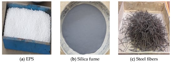 To produce EPS-based concrete, the coarse aggregate was replaced with EPS at 0%, 15%, 30%, and 45% in the concrete mix. In addition, to reduce the brittleness of the concrete mixture, steel fibers (SFs) of 1 mm in diameter and 50.8 mm in length were added at 2% and 4% by weight of concrete mixed. The SFs were obtained from annealed wires via a process of thermal annealing and from burnt wires during the process of iron settings. The typical physical appearance of these materials is presented in Figure 1a–c. Finally, commercially available supplementary cementitious material (SCM), such as silica fume, was utilized to adjust the EPS-based concrete flow. The chemical compositions of OPC and SFs are summarized in Table 2.