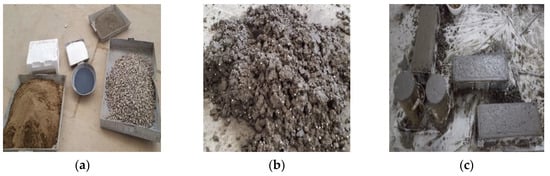 Preparation of test specimens. (a); Constituents of EPS-based concrete; (b) Mixing; (c) Casting of cylinders and beams.