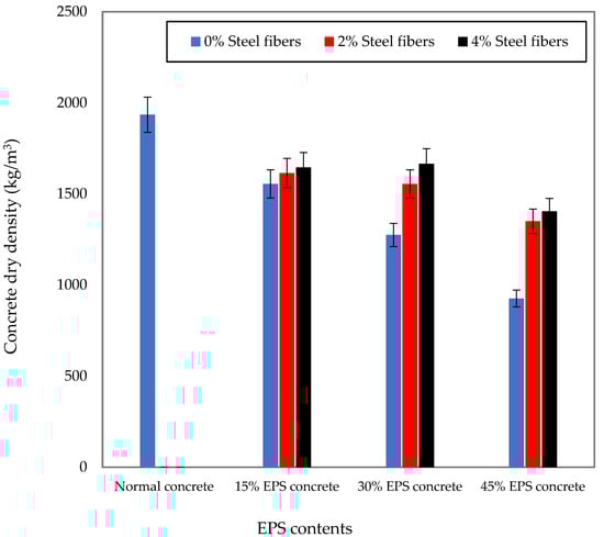 Lightweight concrete (LWC) has gained more interest and is increasingly being explored by researchers due to its low density in contrast to conventional concrete. Interest in LWC has increased as an alternative solution to normal concrete due to its low dead load and self-weight of structural elements. As a result, smaller sections can be achieved. According to a study, the compressive strength and bulk density of low-strength but lightweight concrete ranges from 7 to 18 MPa and 800 to 1400 kg/m3, respectively [1]. In past decades, researchers have tried to use different alternative materials as substitutes for aggregates to prepare LWC that can achieve acceptable strength with lower self-weight [2,3]. Initially, aggregates made from expanded fly ash, clays, preprocessed shales, and those that come from natural porous volcanic sources were used to lower the density of LWC [4]. In the beginning, lightweight concrete was mainly used as an insulating material with air-entrained mixes of volcanic ash and hydrated lime to lessen the overall weight of the material [5]. These low-density artificial lightweight aggregates have been used in concrete with varying degrees of success in density reduction. In recent years, expanded polystyrene (EPS) has been used as an alternative material to aggregates. The concrete industry has paid more attention to EPS due to its adequate low density, relative strength, and good thermal resistance. Expanded polystyrene is a lightweight cellular plastic with small spherical particles of 98% air and a wide range of densities (10 to 20 kg/m3). The properties it possesses include having a closed-cell nature, being lighter weight and nonporous, and hydrophobicity [6]. The utilization of EPS aggregate in concrete is mainly to reduce its overall weight in comparison to conventional concrete, which has a large self-weight with a low strength-to-weight ratio and substandard performance of thermal insulation [7]. The keen innovation in the advancement of EPS-based concrete was the preparation under air-entrained conditions using lightweight aggregates (LWAs) of polymeric particles having bulk densities of about 16 to 160 kg/m3. From the experimental work, it was observed that EPS beads of smaller sizes yielded concrete having a reasonable strength in the absence of additives [2]. In addition, 30% EPS incorporation by volume of self-compacted concrete could reduce the density and compressive strength up to 30% and 40%, respectively [8]. Similarly, in another study, the utilization of EPS in concrete mix was examined. It was reported that with the addition of EPS in concrete without a superplasticizer, the density decreased by about 11.3% and 16.2% vice versa [9]. It was also reported that 5% EPS substitution as fine aggregate in concrete resulted in 16% lower compressive strength in comparison to control specimen strength. However, by increasing the EPS content up to 10%, the tensile strength was enhanced by 43% [10]. Other research also demonstrated EPS’s effectiveness in enhancing concrete’s durability and mechanical properties [11]. So, EPS is a discarded waste product like other various types of waste, and it has superior physical and mechanical capabilities that can be incorporated in concrete mix at optimal levels without compromising the strength of concrete in order to meet the demands for modern buildings and construction [12,13,14].