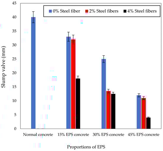 The EPS-based lightweight concrete’s workability was evaluated in terms of slump test at a constant water: binder ratio of 0.60. The values of the slump measurements are reported in Table 5. All proportions of mixes had slump values in the range of 4–40 mm (Figure 4). The concrete mix with 15% EPS content and without steel fibers had a slump value of 33 mm, which was 20% less than standard concrete. This could be due to the lightweight and hydrophobic nature of EPS, which tends to reduce the water absorption capacity of the concrete mixture as a result EPS particles floating up due to segregation and bleeding. Although at this value, the mixes were flexible and easily worked without compaction. Furthermore, the testing results indicated that the workability of concrete at the plastic stage was affected by the contents of EPS and steel fibers. It was observed that the slump of fresh concrete decreased with the addition of steel fibers because steel fibers held all of the ingredients together without segregation. The steel fibers contributed to decreasing the slump value of the concrete mix used for the specimens and helped to reduce the bleeding. When steel fibers were utilized as 4% of concrete with the same EPS dosage of 15%, there was about a 35% reduction in the slump value. Moreover, the addition of silica fume also reduced the slump value due to its pozzolanic properties. Silica fume reacts with calcium hydroxide to form additional cementitious compounds. This reaction can help control bleeding by absorbing excess water and preventing it from rising to the surface.