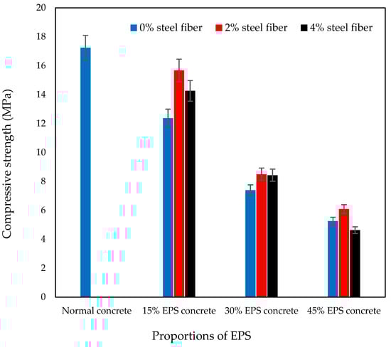 The specimens made with the incorporation of a higher content of EPS had the least compressive strength. This reduction could be attributed to the lightweight and hydrophobic nature of EPS [31], which tended to reduce the water absorption capacity of the concrete mixture and float up, with segregation occurring as a result. The compensation for the reduction in concrete strength with the incorporation of EPS has also been discussed in a previous study. For example, EPS with 15% replacement of coarse aggregate reduced the compressive strength of lightweight concrete up to 45% [32]. Steel fibers were incorporated to amplify the compressive strength to counter the effect of improper bonding in EPS-based concrete. For instance, in concrete with 15% EPS and 2% steel fibers, the strength was slightly reduced to 10% compared with normal concrete. The concrete samples that contained 30% EPS with 4% steel fibers had 34.6% less compressive strength than normal concrete. Similarly, the compressive strength of concrete that contained 45% EPS with 4% steel fibers showed 74.6% less strength than normal concrete.
