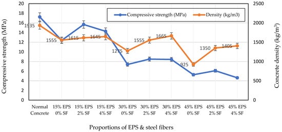 Density and compressive strength of normal concrete compared with various contents of EPS and steel fibers.