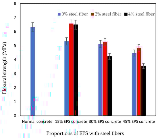 It is notable that with the same content of 15% EPS and 4% steel fibers, the flexural strength improved to 3.5% compared to normal concrete. Similar results were reported: even after flexural cracking, the steel fibers could endure the elongation and expansion of cracks [33]. This is a virtue of steel fibers, which act as a bridge prior to cracking and reduce the disintegration of aggregates in concrete mixes. It could also be due to the fact that steel fibers hold crack expansion and elongation even after failure due to bending since they are made of steel. Further substitution of EPS in concrete with steel fibers showed a decrease in flexural strength. For example, with 30% and 45% incorporation of EPS and 2% steel fibers, the flexural strength was reduced to 18% and 25% in contrast to normal concrete. To conclude, the inclusion of 15% EPS in concrete with 2–4% steel fibers influenced and increased the flexural strength of concrete. Ultimately, using steel fibers in EPS-based concrete at this optimal level improved the durability and material ductility.