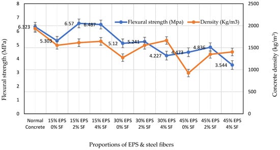 The flexural strengths of the beam specimens after 28 days against density with different contents of EPS and steel fibers are shown in Table 9. The stress at failure in bending of concrete was established and reduced linearly with the addition of only lightweight EPS contents corresponding to density. However, when 15% EPS and 2% steel fibers were introduced, a 5% enhancement in the flexural strength of EPS-based concrete was observed alongside a remarkable 17% reduction in density compared to standard concrete. Further, at 15% EPS and steel fiber content up to 4%, there was a 3.5% improvement in strength coupled with a 15% decrease in density compared to the normal concrete benchmark, as evidenced in Figure 10.