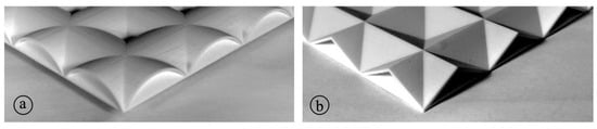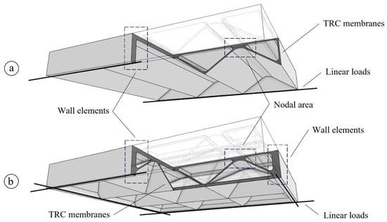 It may be seen from Figure 9 that the load to all the geometry types is applied in a similar manner as a sequence of linear loads to the “peaks” of the triangular folds within the geometry. Thus, the loads are applied in the node zones of the TRC structure. The magnitude of the load is considered as a point of exploration. Therefore, we have a range of loads from 0 kN to the limit load that is determined during a steady increase in the load. The self-load of the structures is, in turn, applied within the framework of the RFEM software as an area load to each of the FEM shell elements separately. Considering the density of concrete of 2350 kg/m³, the area load results in . No partial safety factors are considered in the study, neither on the side of the loads nor on the side of the materials’ resistance; thus, .