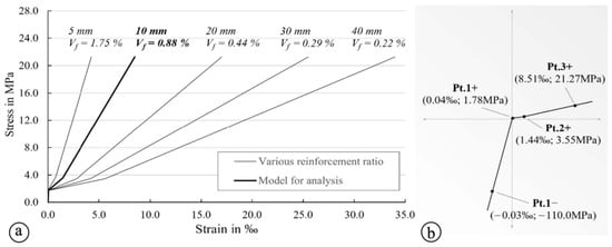 The shell elements were modeled using a single composite material model with a uniform distribution of the properties over the cross section. The FEM model formulation for the textile reinforcement is based on a smeared material model approach. Its application for the purpose of analysis of TRC structures was discussed, e.g., in [14]. When using a smeared material model approach, the next features are to be considered before performing the analysis. First of all, with a smeared model, it is not possible to capture the effect of textile reinforcement placement. The reinforcement is placed quasi-automatically in the center of the cross section. So, the smeared approach necessarily leads to an overestimation of the lever arm [14]. The approach is recommended to be applied to components with predominant membrane forces, which is the case in our project. Secondly, the smeared model ensures a relatively simple analysis routine, but it requires an elaborate preparation of the correct simulation of the uniaxial material behavior of TRC. The uniaxial material model needs to correctly reflect the reinforcement ratio. The TRC material was modeled for a reinforcement ratio range between 0.22% and 1.75% for the purpose of the parametric study in the frame of the project. The results of the simulation are provided in Figure 2a. Figure 2b shows the interface of the used RFEM software package with the integrated key values to represent the stress–strain curve in the uniaxial tensile range in the well-known form of a polyline for a shell thickness of 10 mm, see, e.g., [15,16,17].