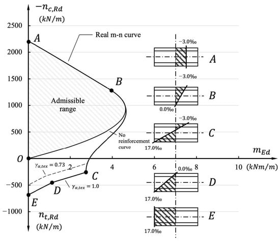 In the first step, the failure criteria were considered in the form of a simplified m-n diagram according to [24]. Such an approach is relatively conservative and may result in an underestimation of the ultimate cross-sectional strength but remains on the so-called “safe side” [28]. For the purpose of research and to consider the full potential of the investigated TRC structures, the m-n diagram should be expanded to match the experimental results. Thus, a more realistic representation of the m-n relation was required. In [29], a good insight is provided into the formulation of a more realistic m-n diagram for thin-walled concrete shells that are reinforced with textile reinforcement and how to set up a suitable analytical model. The way in which the m-n diagram is structured is similar to the well-known method used for the estimation of the critical load-bearing capacity of steel-reinforced concrete structures, see, e.g., [30,31]. In Figure 5, the key aspects and the assembly points used for the m-n diagram for TRC structures are represented.