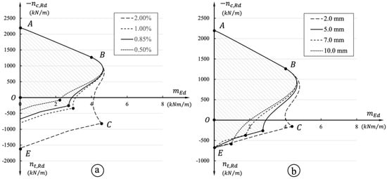 One overarching key task of the project is to perform a wide parametric study to find efficient possible solutions for shell-like TRC structures for varying boundary conditions. The described above approach for constructing the admissible bearing range for TRC structures ensures fast and convenient processing of the data derived from the FEM solver. The numerical tool MOET introduced in its basic outlines in Section 2.1 and inserted respective modules are able to recreate such m-n diagrams for different thicknesses and reinforcement layers by generating an appropriate number of points that detect the limits of the admissible range. Such a generation is performed after each iteration step of the FEM solver for different parts of the structure where a deviation in parameters such as the total thickness of the shell, the amount of reinforcement , the thickness of the concrete cover , or the number of the textile reinforcement layers occurs. To better illustrate the dependency of the m-n diagram on different parameters, Figure 6 gives an insight into how realistic the m-n envelope deviates due to changing the reinforcement ratio from 0.5 to 2.0% (Figure 6a) and due to altering the concrete cover from 2 to 10 mm (Figure 6b).