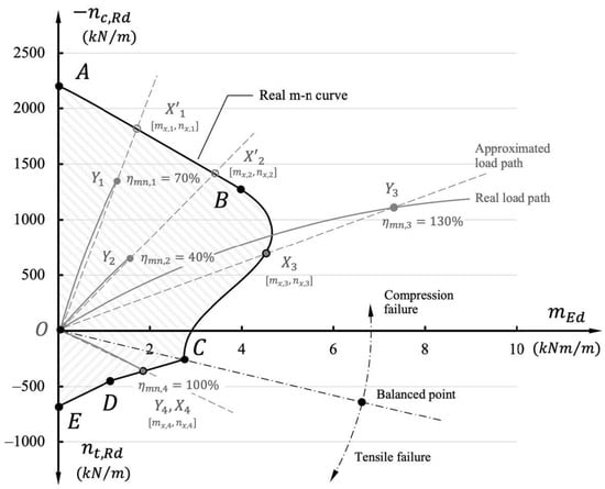 Figure 7 shows the key principle. Thus, we differentiate three possible cases of so-called load state points: an admissible range for points like Y1 and Y2 that do not reach the failure state, points Y4 that is lying directly on the m-n curve and therefore just reached the limit, and finally points like Y3 outside the admissible range which are considered as failed points but located away from the m-n curve due to the ability of the FEM solver to reach a stress state that is beyond the critical values as indicated in Section 2.2. Each of the points Yi can be connected with the point of origin of the m-n diagram by a line . The line itself represents a so-called load path that indicates the way each load state point performs until reaching the failure load. The assumption of a linear load path corresponds to the case when a concrete member is considered to be short without imperfections [33,34]. The intersection of the load path and the m-n curve could be real in the case where the load state point reached the failure state or prognosed . Then, the position of the intersection points can be compared with the point that corresponds to the balanced failure state. Finally, if the intersection point belongs to the range above the point , we can indicate a compression failure. A tensile failure occurs if the intersection point lies in the range below point . In that way, all the load state points can be subdivided into four groups: points that reached the failure either in the compression or the tensile range and points that are exposed to subcritical compressive or tensile stress.
